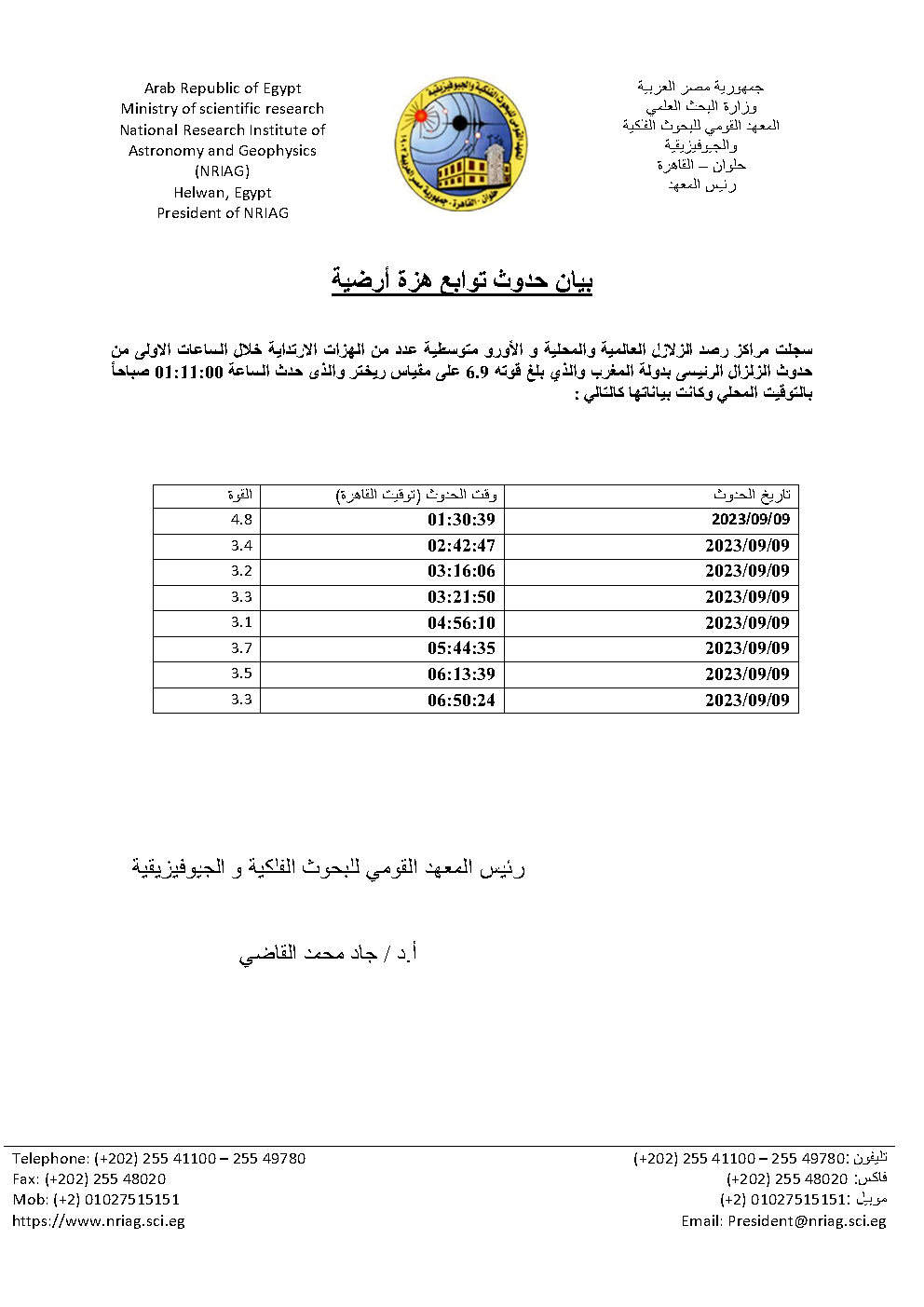 كشف الدكتور جاد القاضي، رئيس المعهد القومي للبحوث الفلكية والجيوفيزيقية، إن الزلزال الذي ضرب المغرب كانت له توابع، حيث سجلت مراكز رصد الزلازل المحلية والعالمية والأورومتوسطية عددًا من الهزات الارتدادية خلال الساعات الأولى من حدوث الزلزال الرئيسي بدولة المغرب الذي بلغ قوته 6.9 على مقياس ريختر والذي حدث 1 صباحًا بالتوقيت المحلي.
