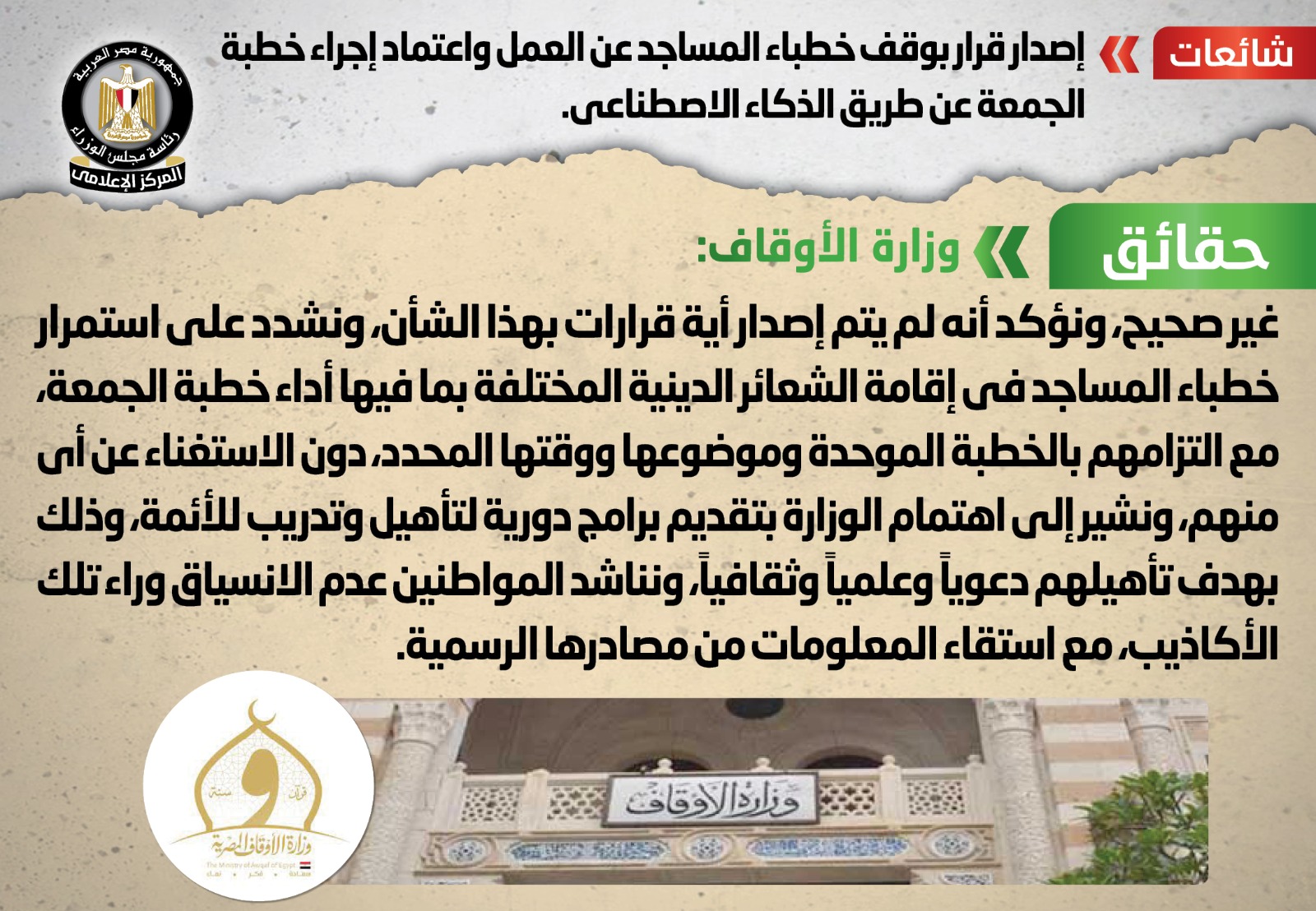 أعلن المركز الإعلامي لمجلس الوزراء، ووزارة الأوقاف، أنه لا صحة لوقف خطباء المساجد عن العمل واعتماد إجراء خطبة الجمعة عن طريق الذكاء الاصطناعي.
