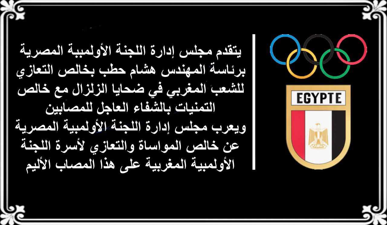 يتقدم مجلس إدارة اللجنة الأولمببة المصرية برئاسة المهندس هشام حطب بخالص التعازي للشعب المغربي في ضحايا الزلزال مع خالص التمنيات بالشفاء العاجل للمصابين.