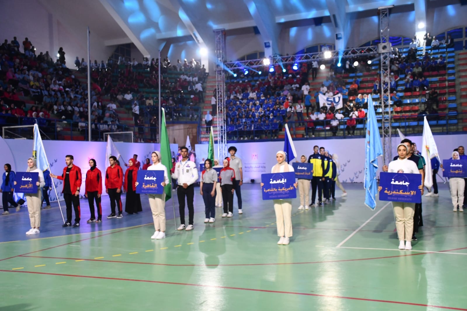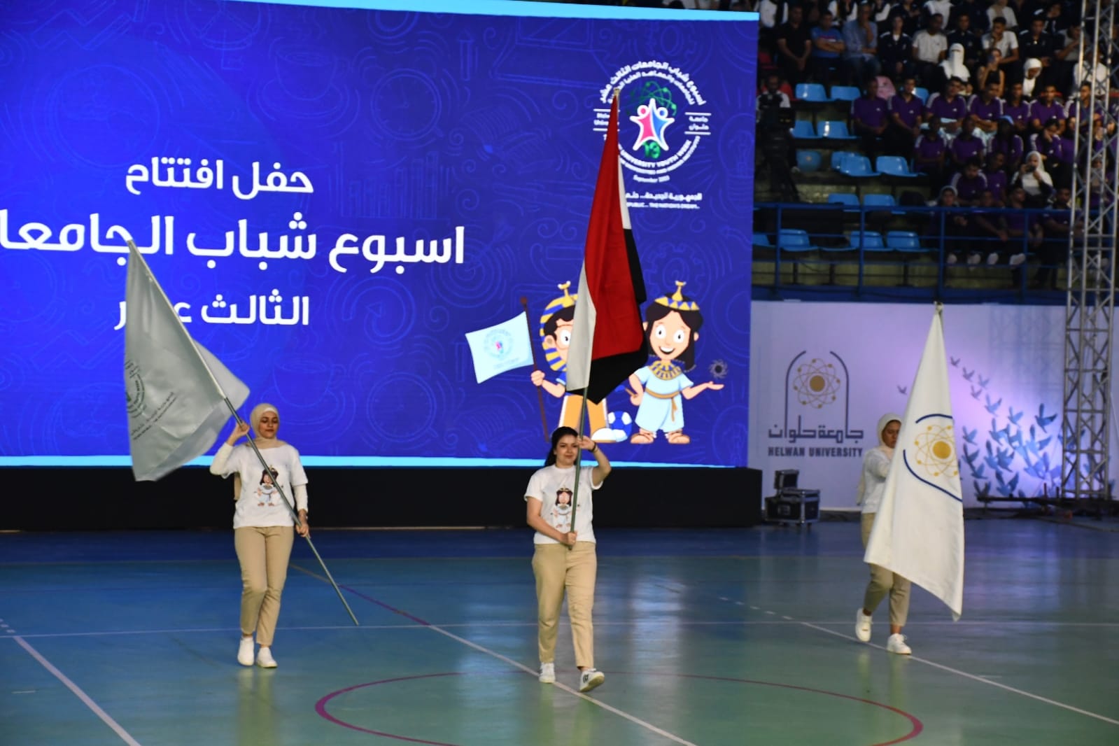 وبدأت فعاليات الحفل بطابور عرض الجامعات المشاركة، ورفع علم مصر وعزف السلام الوطني، ووصلت شعلة وعلم أسبوع شباب الجامعات والمعاهد، واصطف الإداريون واللاعبون والحكام في طابور عرض بالصالة المُغطاة بجامعة حلوان، كما تم عرض فيلم وثائقي عن أسبوع شباب الجامعات، ثم بدأت فقرات حفل الافتتاح.