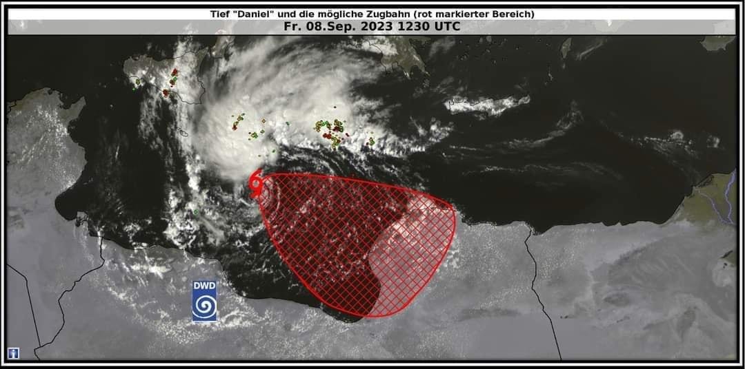 وأطل إعصار "دانيال" برأسه على السواحل الليبية، اليوم الأحد ويكون تأثيرها قوي، حسب التوقعات على مناطق الجبل الأخضر وبنغازي حتى اجدابيا.
