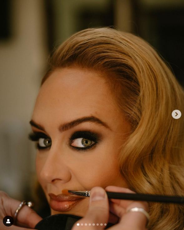 وأرادت أديل إبراز جمال عينيها، بإعتماد صيحة سموكي آي، فإختارت ظلال العين بدرجات الأسود مع البني الداكن، بالإضافة إلى الكحل والماسكرا؛ لتحصل على عينين ساحرتين ورموش أكثر طولًا وكثافة، واختارت أحمر شفاه باللون النود؛ ليضيف لمسة ناعمة وهادئة للوك.