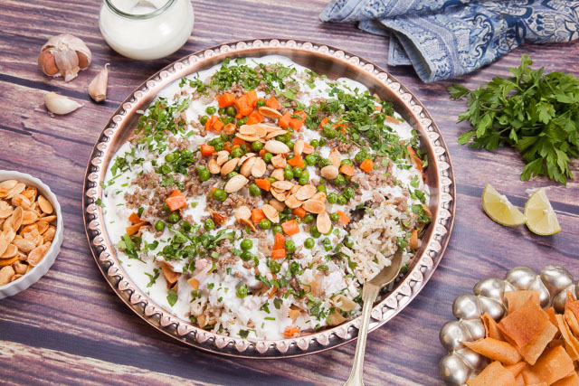 وزعي الخبز المقطع والمقلي بقاع أطباق التقديم، أضيفي من صوص اللبن، ووزعي الدجاج. زيني باللوز والرمان بحسب الرغبة.