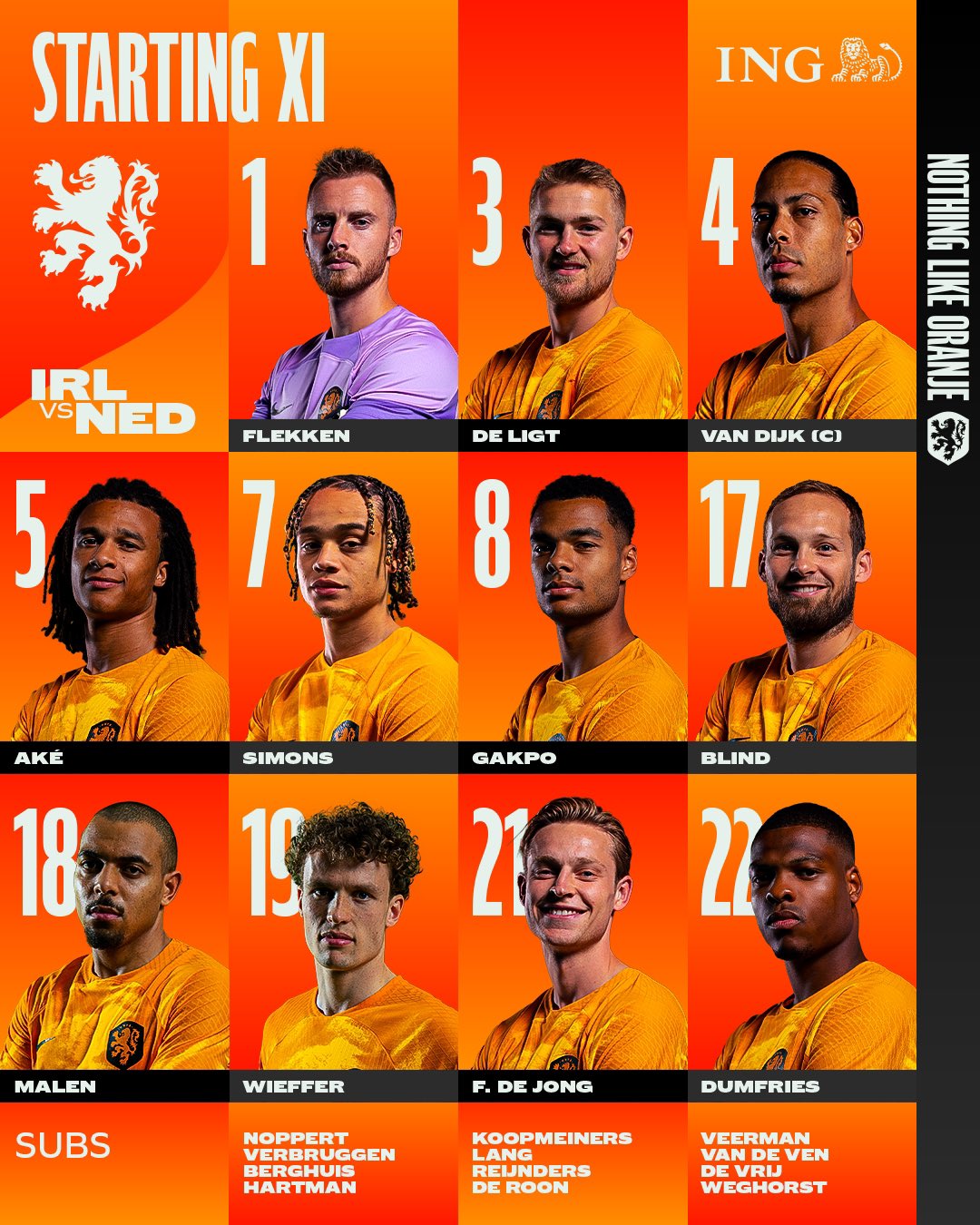 وجاء فيرجيل فان دايك على رأس تشكيل هولندا لمواجهة إيرلندا، ومعه آكي وماتياس دي ليخت في خط الدفاع، ويوجد دي فري على مقاعد البدلاء، وجاء التشكيل مكون من:-