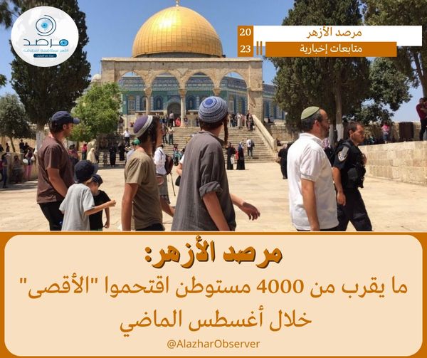 أكد مرصد الأزهر لمكافحة التطرف، في تقريره الشهري أن ما لا يقل عن 3,892 مستوطنًا اقتحموا المسجد الأقصى خلال شهر أغسطس الماضي، تحت رعاية عدد من الحاخامات الصهاينة المتطرفين، وبدعم كامل من منظمات الهيكل "المزعوم"، وتحت حماية مشددة من شرطة الاحتلال الصهيوني.