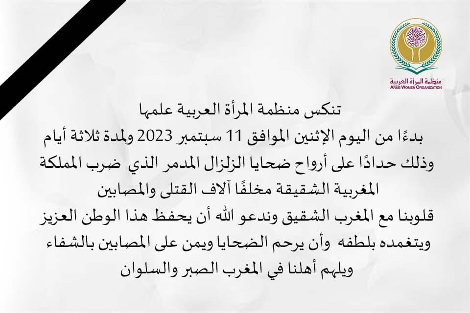 تنكس منظمة المرأة العربية علمها بدءًا من اليوم الإثنين الموافق 11 سبتمبر 2023، ولمدة ثلاثة أيام، وذلك حدادًا على أرواح ضحايا الزلزال المدمر الذي ضرب المملكة المغربية الشقيقة مخلفًا آلاف القتلى والمصابين.
