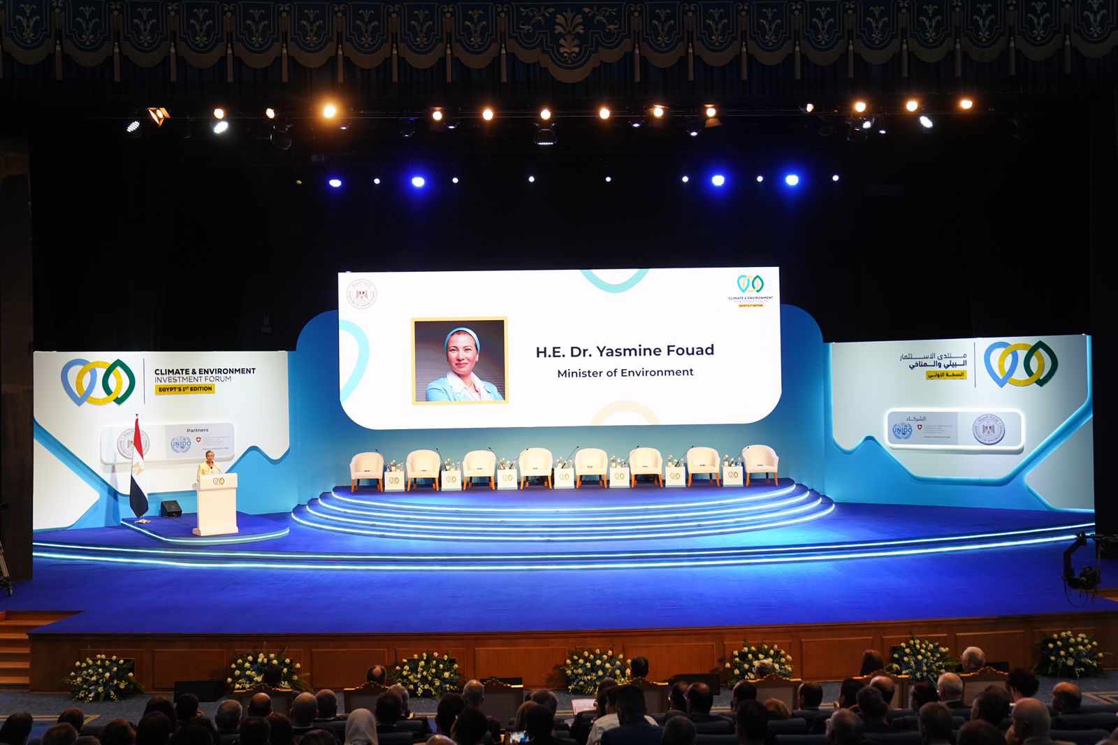 جاء ذلك خلال افتتاح فعاليات النسخة الأولى من منتدى الاستثمار البيئي والمناخي تحت رعاية  رئيس الجمهورية وبحضور رئيس مجلس الوزراء و ايفون باومان سفيرة سويسرا لدى مصر، ولفيف من الوزراء والسفراء وممثلي الحكومة والقطاع الخاص والمجتمع المدني والإعلاميين.