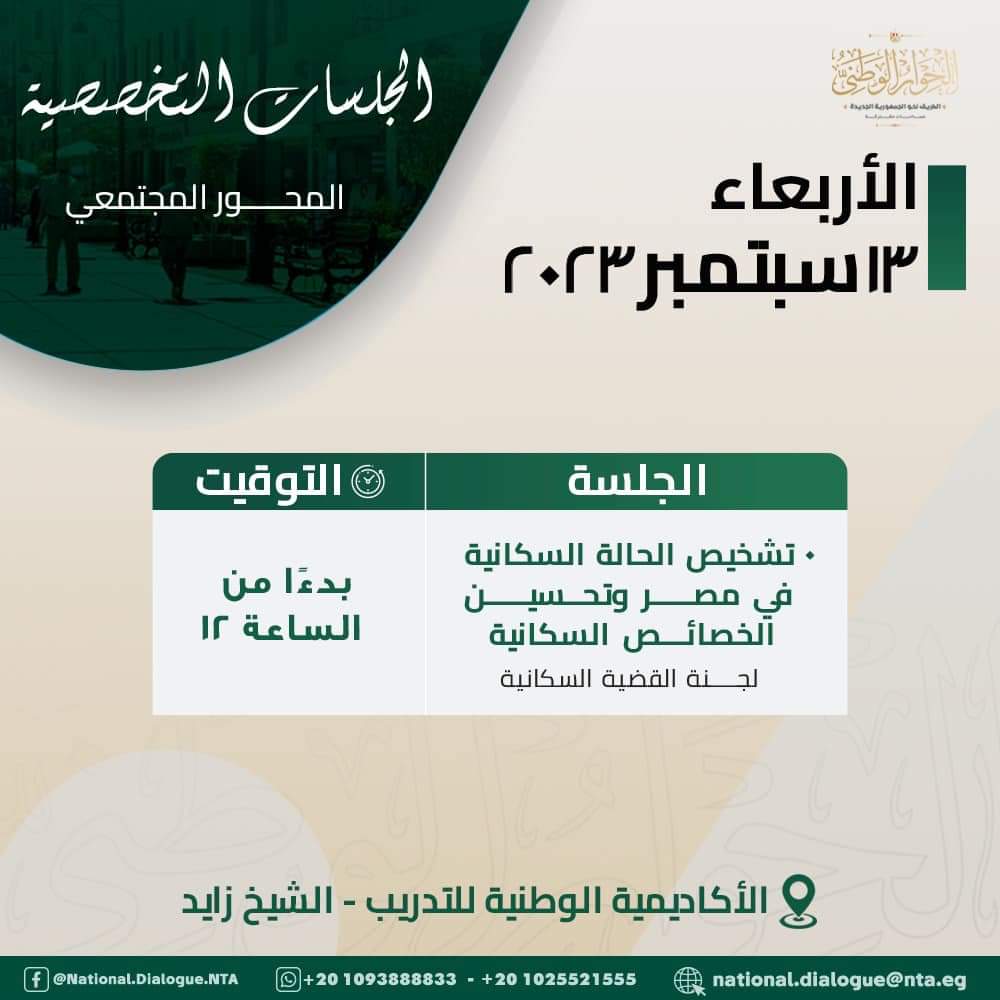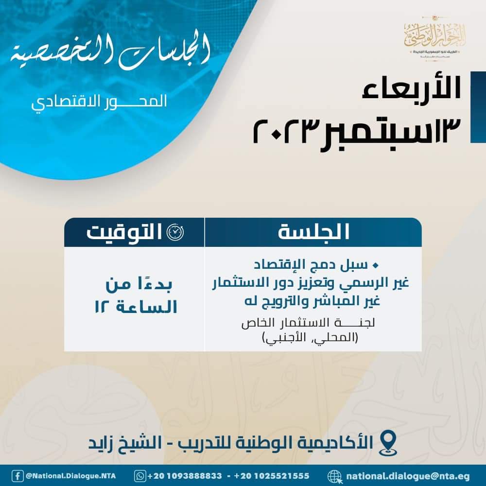 يعقد الحوار الوطني غداً الأربعاء ١٣ سبتمبر جلستين متخصصتين بمقر الأكاديمية الوطنية للتدريب بالشيخ زايد.