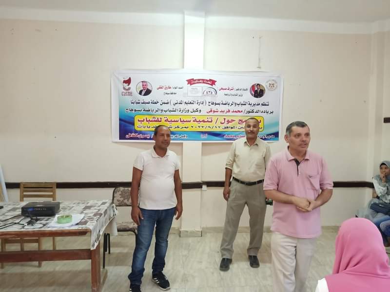 نظمت مديرية الشباب والرياضة بمحافظة سوهاج، فعاليات الصالون البرلماني بقاعة مركز شباب الدبابات التابع لإدارة الشباب والرياضة بمركز ومدينة أخميم شرق محافظة سوهاج، تحت شعار "عشرون عامًا برلمان شباب "، بمشاركة 80 شابًا وشابة من أعضاء برلمان الشباب والطلائع، ونموذج محاكاة مجلس الشيوخ، حول التنمية السياسية للشباب، في إطار فاعليات مبادرة « صيف شبابـنا »، التي أطلقتها الوزارة في كافة محافظات الجمهورية، تحت رعاية الدكتور أشرف صبحي ، وزير الشباب والرياضة وحاضر بالصالون الدكتور الفنجري أحمد محمد استاذ الإجتماع السياسي .