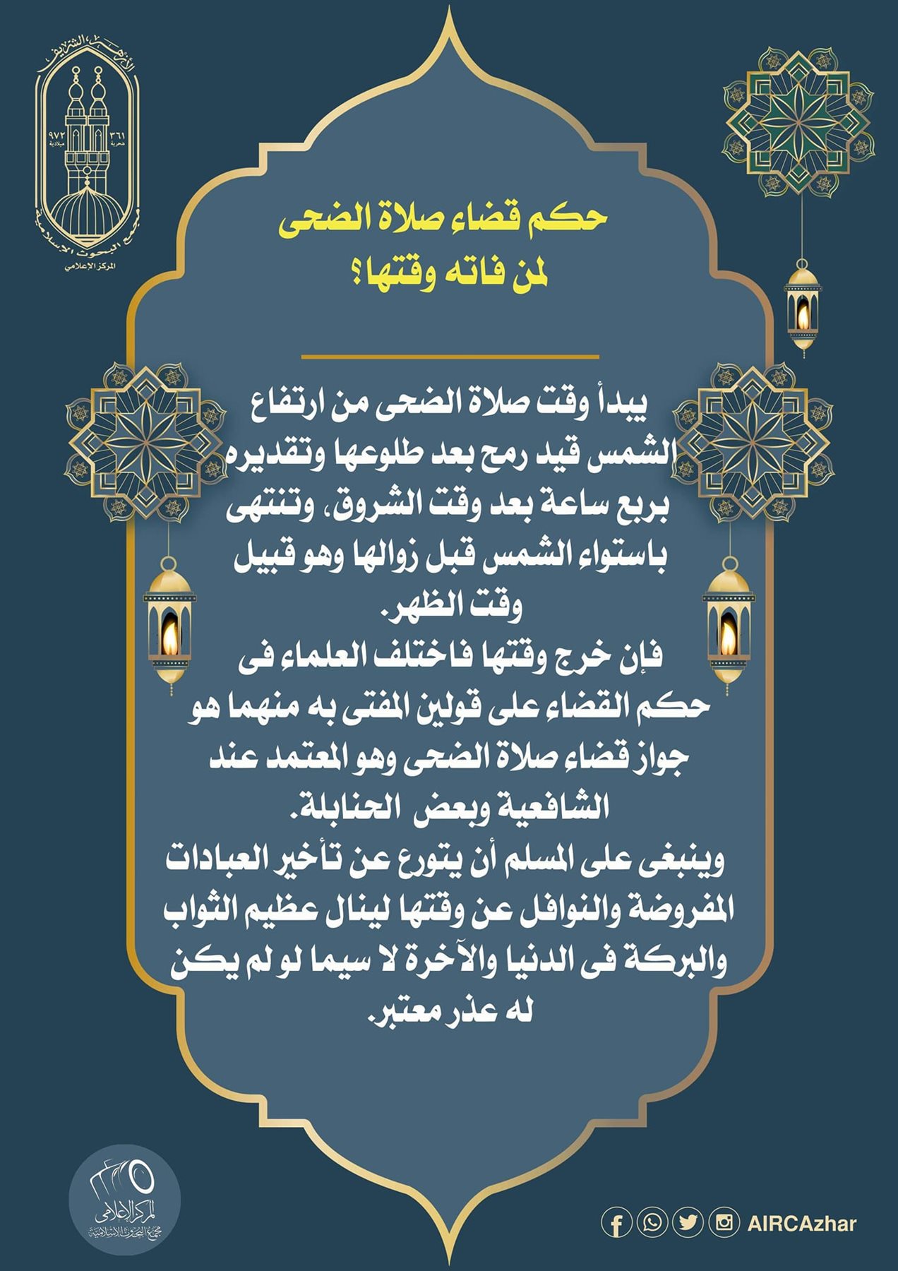 أضافت لجنة الفتوى، أنه إن خرج وقتها فاختلف العلماء فى حكم القضاء على قولين المفتى به منهما هو جواز قضاء صلاة الضحى وهو المعتمد عند الشافعية وبعض الحنابلة.