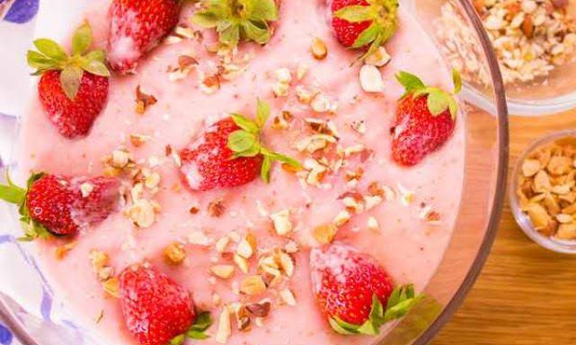 1. اخلطي اللبن الزبادي مع نصف كمية الفراولة.