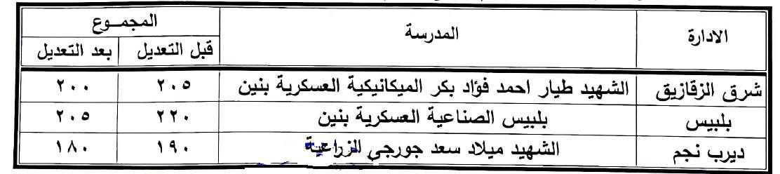 · مدرسة بلبيس الصناعية العسكرية بنين، التابعة لإدارة بلبيس التعليمية 205 درجة بدلا من 220 درجة.