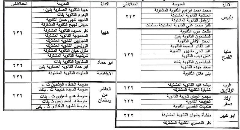 قرر الدكتور ممدوح غراب محافظ الشرقية، النزول بالحد الأدنى لتنسيق القبول بالمرحلة الثانوية للناجحين في الشهادة الإعدادية العامة للعام الدراسي 2022 - 2023 بمراكز "بلبيس – منيا القمح – غرب الزقازيق – أولاد صقر – أبو كبير – ههيا – أبو حماد – الابراهيمية – العاشر من رمضان" على أن يكون الحد الأدنى للقبول بالثانوي العام 222 درجة بدلاً من 225 درجة وفصول الخدمات 185 درجة بدلا من 190 درجة علي أن يسمح بقبول الطلاب الحاصلين علي 222 درجة من أي إدارة تعليمية بشرط استمرار الطلاب بنفس المدرسة طوال سنوات الدراسة بالثانوية العامة وذلك طبقا للجدول المرفق :