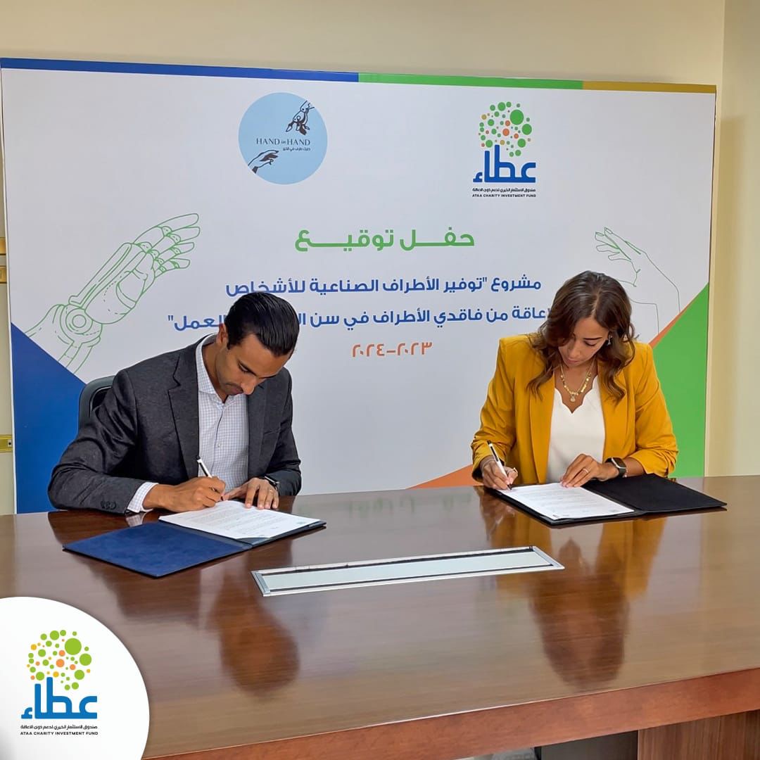 وقع صندوق الاستثمار الخيري لدعم ذوي الإعاقة "عطاء"و مؤسسة إيدينا مع بعض للتأهيل Hand in Hand، اتفاقية شراكة لتوفير 280 طرف صناعي للطلاب في المراحل التعليمية المختلفة والأشخاص في سن العمل من فاقدي الأطراف.