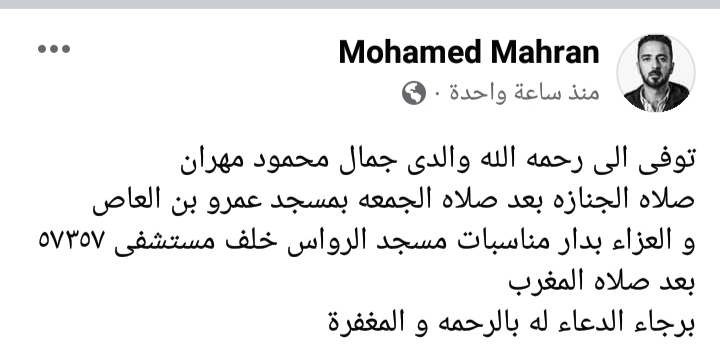وكتب الفنان محمد مهران عبر صفحته، قائلا: "توفي إلى رحمة الله والدي جمال محمود مهران، وصلاة الجنازة بعد صلاة الجمعة بمسجد عمرو بن العاص، والعزاء بدار مناسبات مسجد الرواس بعد صلاة المغرب، برجاء الدعاء له بالرحمة والمغفرة".
