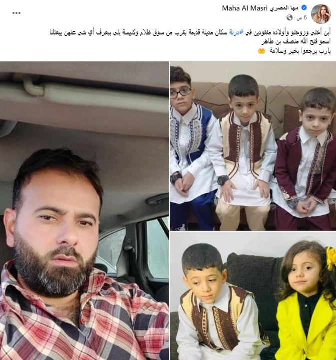 أوضحت المصري، اسمه الكامل ومحل سكنه حتى تسهل عملية البحث عنه، وقالت عبر حسابها على توتير: "ابن أختي وزوجته وأولاده مفقودين في درنة، سكان مدينة قديمة بقرب من سوق ظلام وكنيسة، يلي بيعرف أي شي عنهن يبعتلنا، اسمو فتح الله منصف بن طاهر، يارب يرجعوا بخير وسلامة".