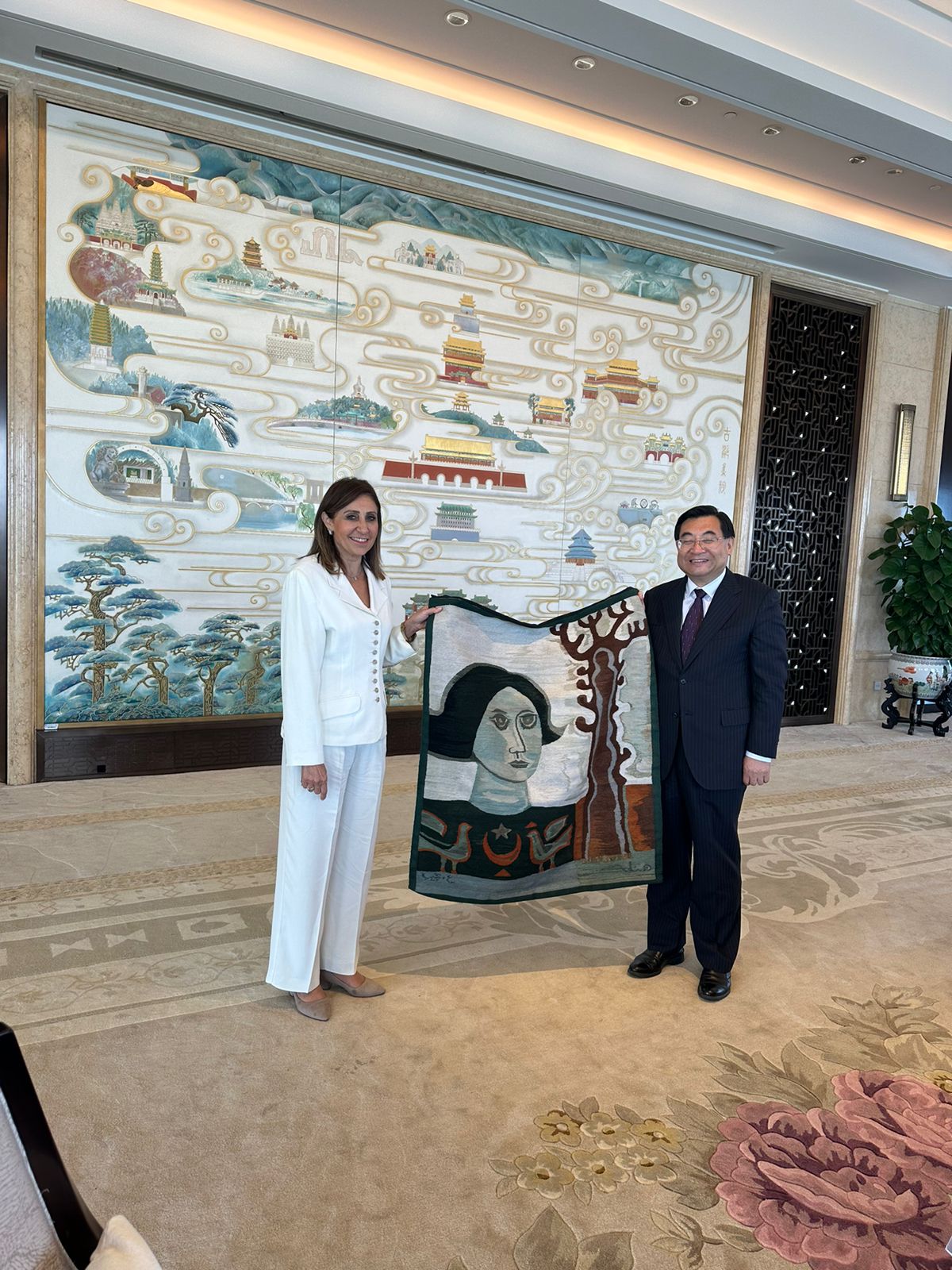 من جانبه أكد هيو هيبنج، حرص وزارة الثقافة والسياحة الصينية على العمل مع وزارة الثقافة المصرية لتطبيق إنجازات القمة الصينية العربية الأولى التي عقدت العام الماضي، والاستمرار في تعميق التبادل والتعاون في مجالات الثقافة والفنون والصناعات الإبداعية، ومواصلة تنظيم فعاليات "التقاء الفنانين في طريق الحرير"، وغيرها من الفعاليات، وتقديم الدعم والمساعدة للفنانين الصينيين والعرب في إقامة الرحلات الإبداعية وعرض الأعمال ومجالات التدريب، وغيرها، مشيرًا إلى أن الصداقة بين الصين والدول العربية تضرب بجذورها في أعماق التاريخ، والتي تتجدد على مر الزمان.