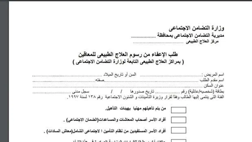 ويتضمن طلب رسوم العلاج الطبيعي بمراكز العلاج التابعة للوزارة، العديد من البيانات منها، اسم المريض والسن وتاريخ الميلاد، اسم مقدم الطلب وصفته، عنوان السكن، رقم البطاقة وتاريخ صدورها، الفئة التي ينتمي إليها الطالب، سواء من يتم تأهيلهم مهنياً، أو أفراد الأسر أصحاب المعاشات والمساعدات.