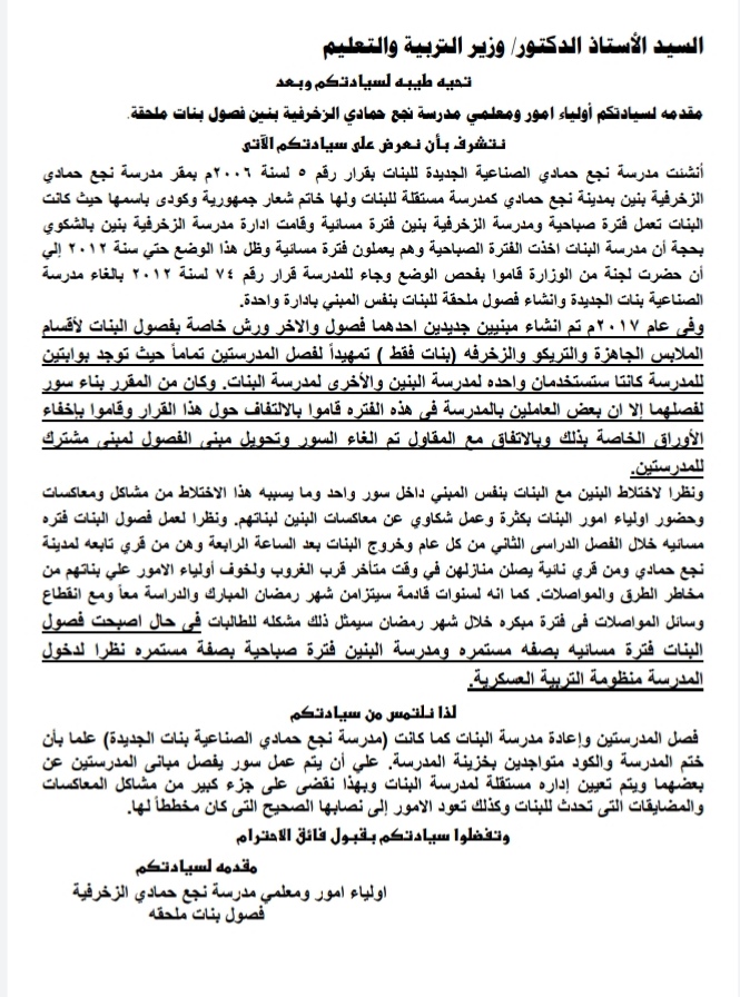 وطالب أولياء الأمور بفصل مدرسة البنات عن مدرسة البنين من خلال إقامة سور فاصل بين المبنيين وعودة المسمى الأساسى وهو المدرسة الصناعية للبنات بنجع حمادي، مضيفين ان ختم المدرسة وشعارها لا يزالا موجودين بالمدرسة إلى وقتنا هذا.