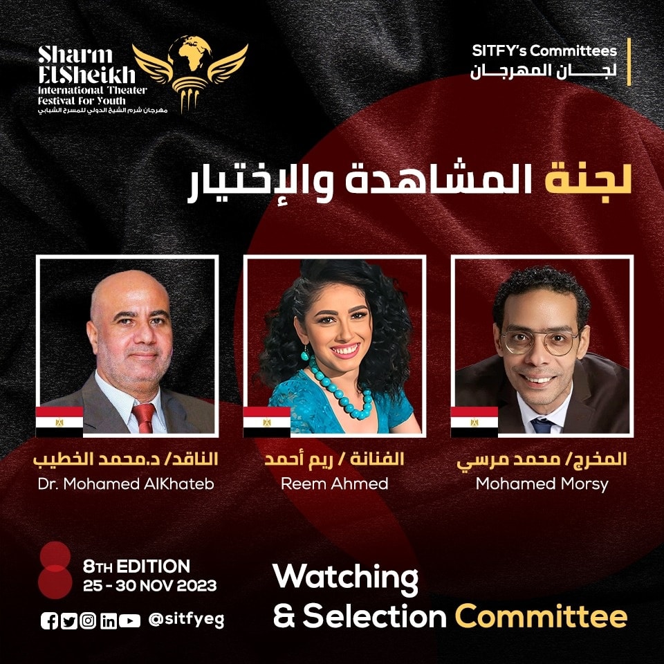 كشفت إدارة مهرجان شرم الشيخ الدولي للمسرح الشبابي، برئاسة المخرج والفنان مازن الغرباوي، عن قوام لجنة المشاهدة والاختيار للدورة الثامنة، والتي تتكون من القامات المسرحية وبحسب الترتيب الأبجدي كما يلي: الفنانة ريم أحمد، الناقد د. محمد سمير الخطيب، والمخرج محمد مرسي.