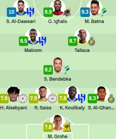 في خط الدفاع: سلطان الغنام “النصر”، كاليدو كوليبالي “الهلال، وثنائي فريق الشباب، رومان سايس وحسين الصبيانى.