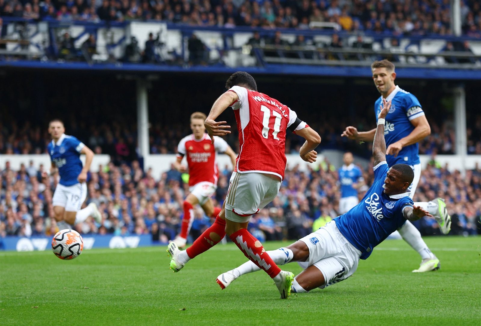 حرم الحكم سيمون هوبر اللاعب البرازيلي جابرييل مارتينيلي من هدف الافتتاح لنادي أرسنال في شباك فريق إيفرتون، بالمواجهة الجارية بين الفريقين على ملعب ستاد جوديسون بارك، ضمن مواجهات الجولة الخامسة من مباريات الدوري الإنجليزي الممتاز لنسخة الموسم الحالي 2023 – 2024.