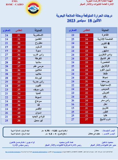 يتوقع خبراء الهيئة العامة للأرصاد الجوية، أن يسود البلاد اليوم الاثنين طقس حار نهارًا على القاهرة الكبرى والوجه البحري والسواحل الشمالية، وشديد الحرارة على جنوب سيناء وجنوب البلاد، وسيكون طقس الاثنين ليلًا معتدل الحرارة على شمال البلاد حتى شمال الصعيد مائل للحرارة على جنوب سيناء وجنوب الصعيد.