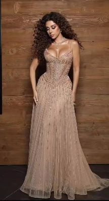 وبدت ميريام فارس بإطلالة فخمة للغاية، لتحسب البساط من تحت أقدام باقي الحضور، حيث ارتدت فستان طويل مجسم من أعلى وفضفاض من أسفل، بدون أكمام، حمل توقيع مصمم الأزياء اللبناني العالمي نيكولا جبران، و تميز بتصميمه المكشوف والضيق من الأعلى وتزيين هذا القسم بحبيبات براقة لينسدل بشيفون واسع تم تزيينه بأحبال طولية متلألئة.