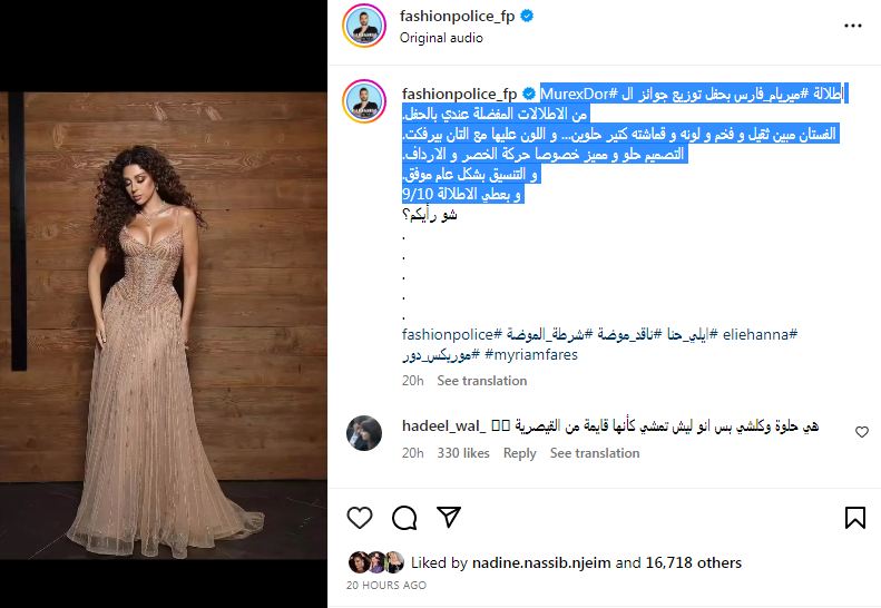 وحرص إيلي حنا على إبداء رأيه بإطلالتها عبر الصحفة الرسمية لشرطة الموضة الإنستجرام، قائلًا: " إطلالة ميريام فارس بحفل توزيع جوائز الموركس دور، من الاطلالات المفضلة عندي بالحفل".