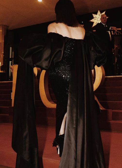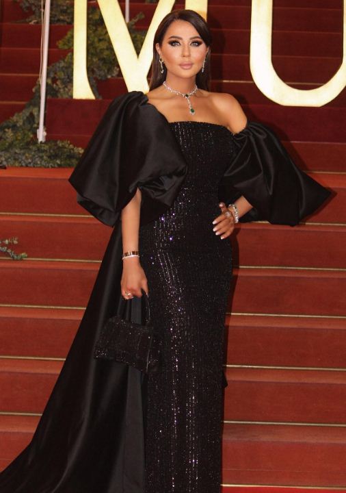 وبدت رابعة الزيات بإطلالة ساحرة، حيث ارتدت فستان طويل مجسم، ينتمي لقصة الكب، صمم من قماش الترتر الأسود وعليه أكمام منسدلة بالساتان، عكس الفستان قوامها الممشوق ووزنها المثالي، الفستان حمل توقيع Dr. Elio Moussallem.