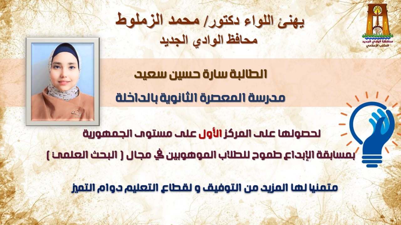 قام اللواء الدكتور محمد الزملوط، محافظ الوادي الجديد، بتوجيه التهنئة للطالبة سارة حسين سعيد على هذا الإنجاز الرائع وحصولها على المركز الأول في مسابقة الإبداع طموح في مجال البحث العلمي على مستوى الجمهورية. تدرس سارة في إدارة الداخلة التعليمية، وقد أثنى اللواء الدكتور محمد الزملوط على قدراتها وموهبتها العلمية الاستثنائية. وأعرب اللواء الزملوط عن فخره بمثل هذه الكفاءات الشابة وثقته في قدرتها على تحقيق المزيد من النجاحات في مجالها.