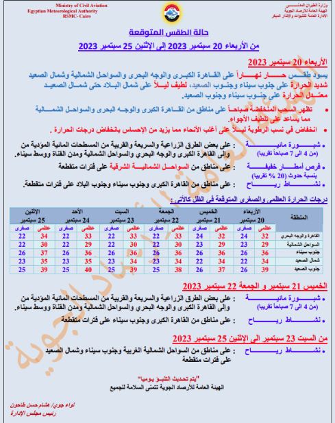 فيما كشفت الهيئة العامة للأرصاد الجوية عن حالة الطقس المتوقعة غدًا الأربعاء 20 سبتمبر، وتوقعت أن يشهد طقس حار نهارًا على القاهرة الكبرى والوجه البحري والسواحل الشمالية وشمال الصعيد.