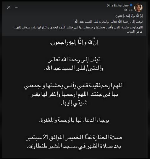 نشرت دينا الشربينى منشورًا، قائلة: "إنَّا لله وإنَّا إليهِ راجعون.