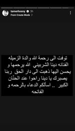 نشر تامر حسني، قائلاً: "توفيت إلى رحمة الله، والدة الزميلة الفنانة دينا الشربيني، الله يرحمها ويحسن إليها، ذهبت إلى دار الحق، ربنا يصبرك يا دينا.. راحوا عند الحنّان الكبير، أسألكم الدعاء بالرحمة لها وقراءة الفاتحة".