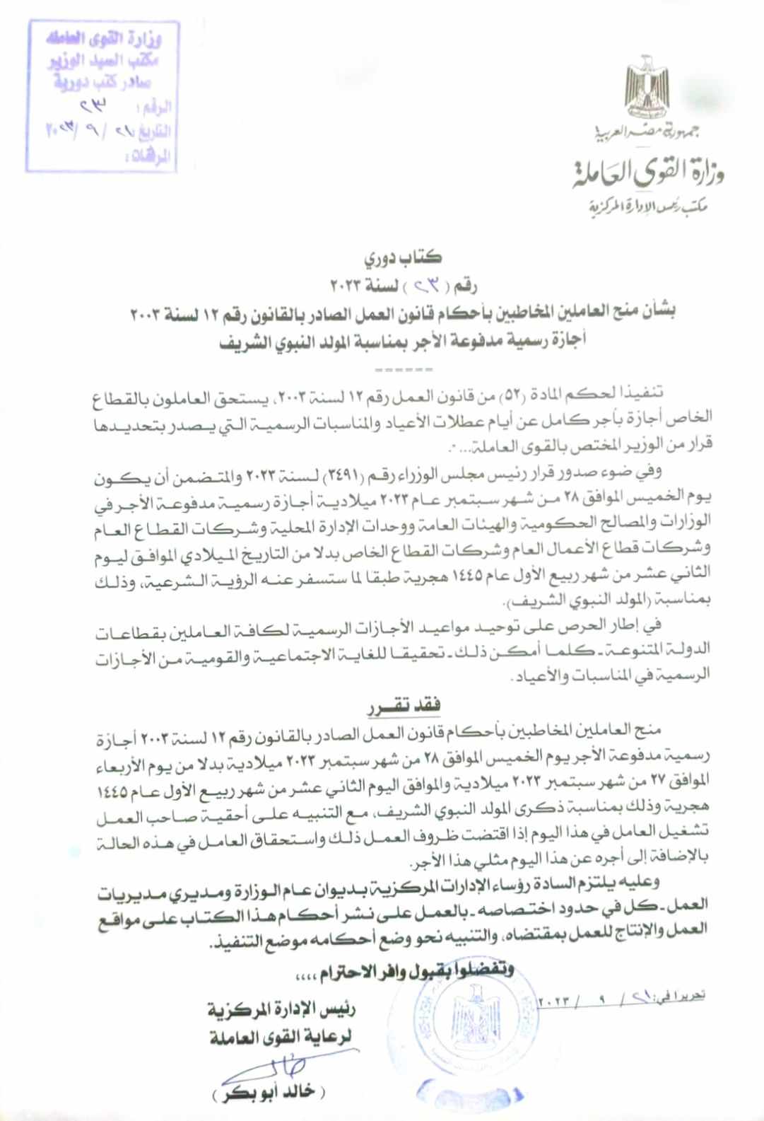جاء ذلك في ضوء صدور قرار رئيس مجلس الوزراء رقم 3491 لسنة 2023 والمتضمن أن يكون الخميس إجازة رسمية مدفوعة الاجر للعاملين في الوزارات والمصالح الحكومية والهيئات العامة ووحدات الإدارة المحلية وشركات القطاع العام وقطاع الأعمال العام والقطاع الخاص بدلاً من التاريخ الميلادى الموافق 12 من شهر ربيع الأول عام 1445 هجرياً طبقاً لما ستسفر عنه الرؤية الشرعية، وفى إطار الحرص على توحيد مواعيد الإجازات الرسمية لكافة العاملين في قطاعات الدولة المتنوعة كلما أمكن ذلك تحقيقاً للغاية الاجتماعية والقومية من الإجازات الرسمية في المناسبات والأعياد.