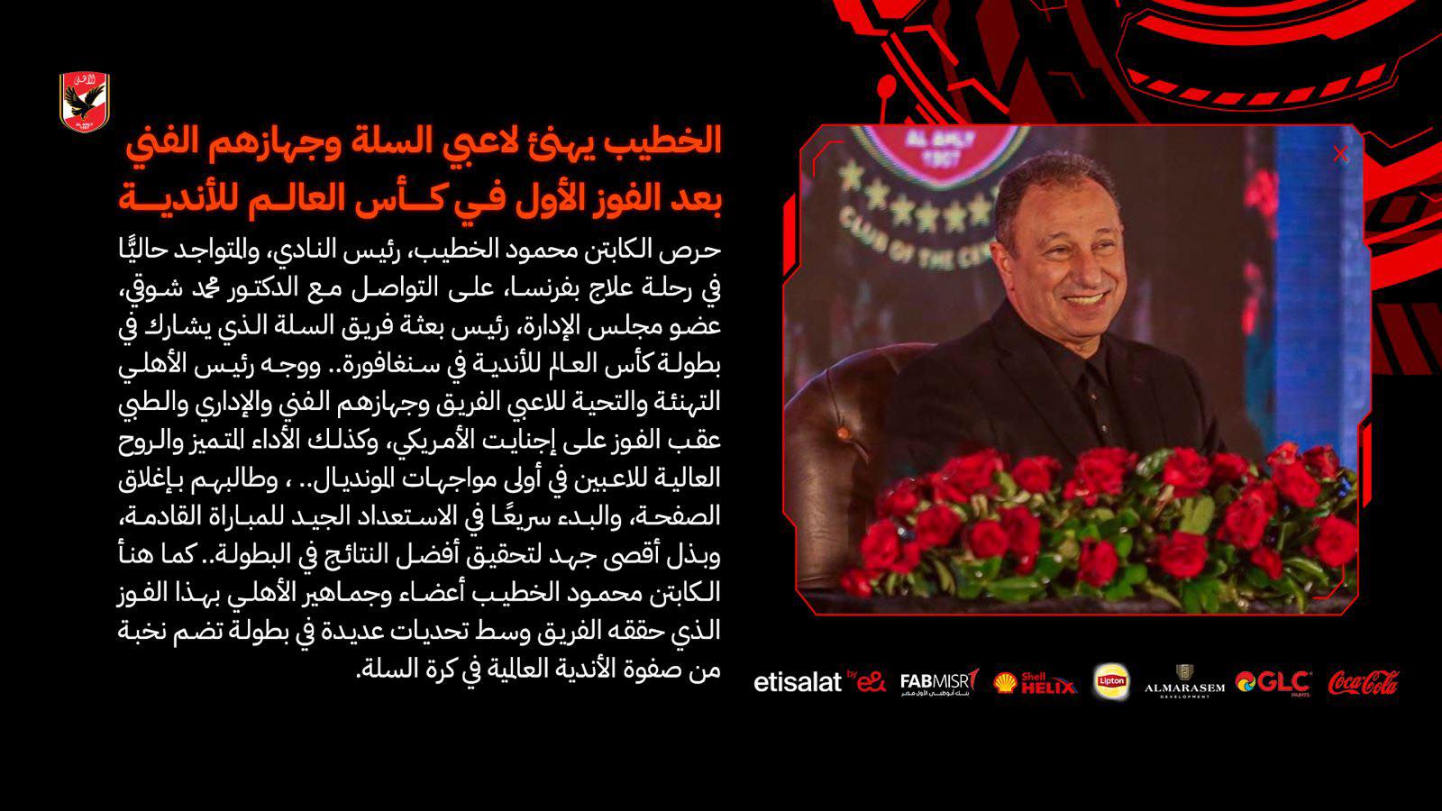 وطالبهم بإغلاق الصفحة، والبدء سريعًا في الاستعداد الجيد للمباراة القادمة، وبذل أقصى جهد لتحقيق أفضل النتائج في البطولة.. كما هنأ الكابتن محمود الخطيب أعضاء وجماهير الأهلي بهذا الفوز الذي حققه الفريق وسط تحديات عديدة في بطولة تضم نخبة من صفوة الأندية العالمية في كرة السلة.