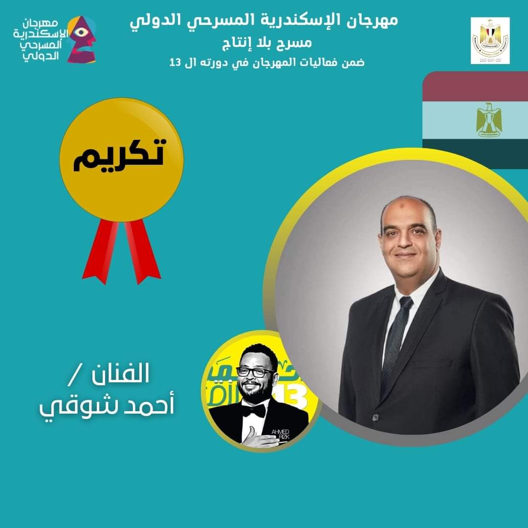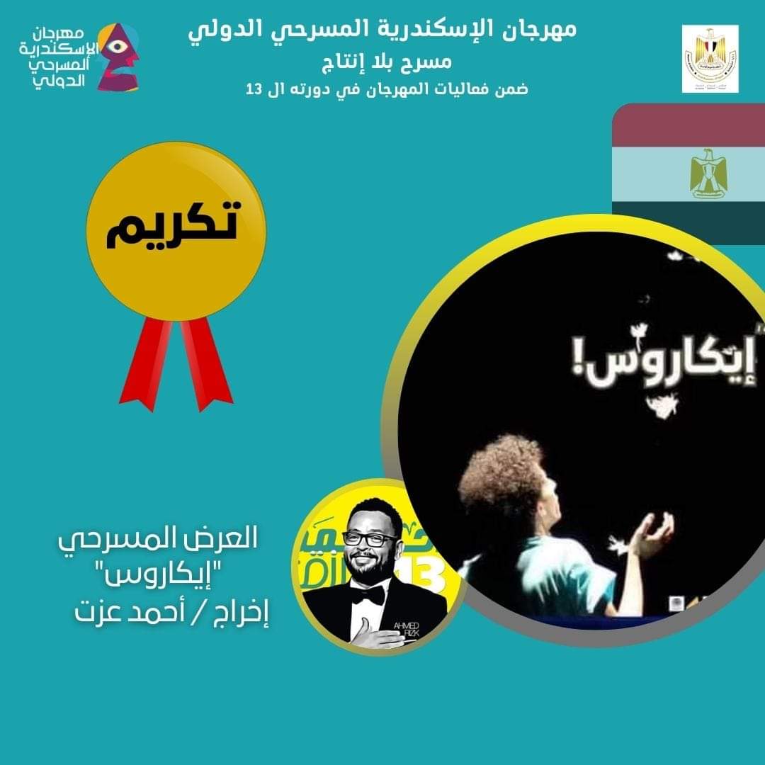 أعلنت ادارة مهرجان الإسكندرية المسرحي الدولي في دورته الثالثة عشرة عن المكرمين في حفل الافتتاح وذلك في حضور حامل إسم الدورة ، النجم أحمد رزق ، سيتم تكريم العرض المسرحي " إيكاروس " من إخراج الفنان أحمد عزت ، لحصوله علي جائزة أفضل عرض بمهرجان القاهرة الدولي للمسرح التجريبي.