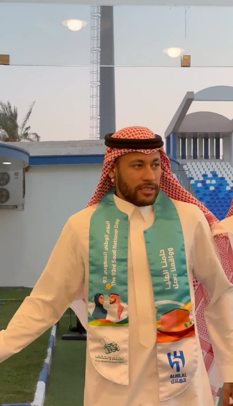 شارك نيمار نجم نادي الهلال في اليوم الوطني السعودي الـ 93 اليوم وهو يرتدي الملابس السعودية ويبدو سعيدًا للغاية مع الجمهور، وكان يردتي الثوب والشماغ والعقال وأدى اللاعب أيضًا رقصة العرضة السعودية.