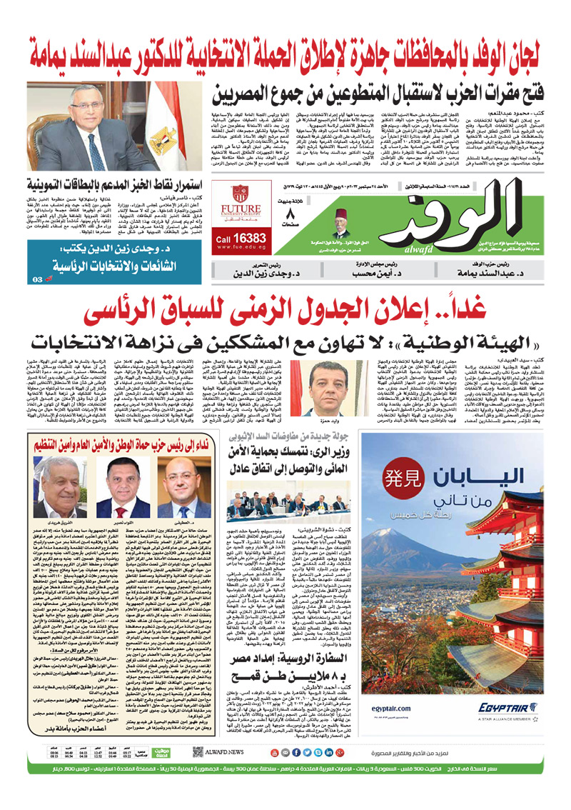 تنشر جريدة الوفد اليومية الورقية في عددها الصادر، غدًا الأحد، العديد من الموضوعات والتقارير الإخبارية المهمة، أبرزها: "غدًا.. إعلان الجدول الزمني للسباق الرئاسي".