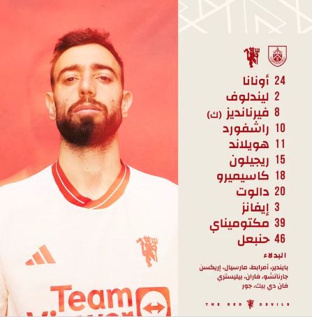 وجاء حنبعل على رأس تشكيل مانشستر يونايتد لمواجهة بيرنلي في تشكيل يضم كل من ماركوس راشفورد وكاسيميرو، ويتواجد سفيان أمرابط على مقاعد البدلاء، في لقاء يبدأ فيه المدر الهولندي بطريقة لعب 4-3-3، والتي تضم كل من:-