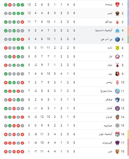 يحتل بريست ترتيب الدوري الفرنسي برصيد 13 نقطة، فيما يحل نيس وصافة المسابقة بـ 12 نقطة، وموناكو ثالث الترتيب بـ 11 نقطة، بينما يأتي مارسيليا في المركز الرابع بـ 9 نقاط، وباريس سان جيرمان خامسًا بـ 8 نقاط.