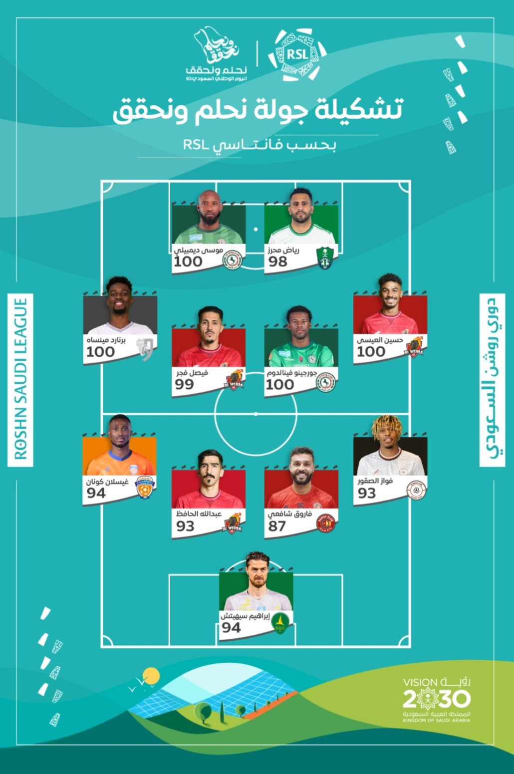 في خط الهجوم: رياض محرز (الأهلي)، موسى ديمبيلي (الاتفاق).