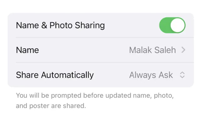 إذا اخترت الاحتفاظ بميزة المشاركة قيد التشغيل، فلديك خياران. أولاً، يمكنك تحديد مشاركة صورة جهة الاتصال الخاصة بك تلقائيًا مع جهات الاتصال الموجودة فقط. وبدلاً من ذلك، يمكنك تمكين ميزة السؤال دائمًا، والتي ستطالبك بالموافقة قبل مشاركة جهة الاتصال الخاصة بك مع أشخاص جدد.