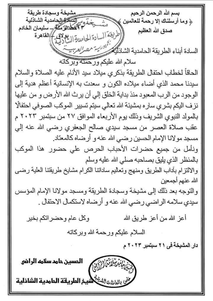 وعقب وصول الموكب إلى مسجد الحسين، يقام احتفال المشيخة العامة للطرق الصوفية بالمولد النبوي، بحضور نخبة من القيادات التنفيذية وكبار العلماء.