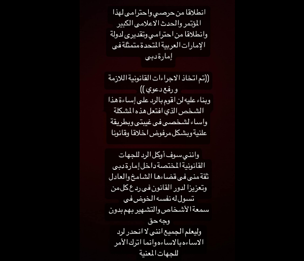 وأوضحت: «سوف أوكل الرد للجهات القانونية المختصة داخل إمارة دبي ثقة مني في قضائها الشامخ والعادل وتعزيزًا لدور القانون في ردع كل من تسول له نفسه الخوض في سمعة الأشخاص والتشهير بهم دون وجه حق وليعلم الجميع أنني لم أنحدر إلى مستوى رد الإساءة بالإساءة وإنما أترك الأمر للجهات المعنية».