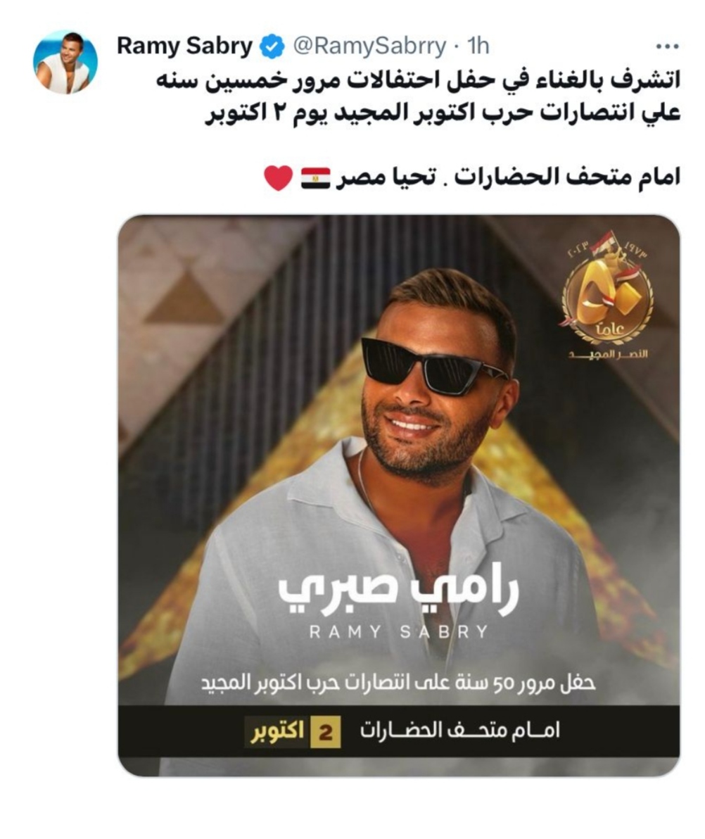 نشر رامى صبرى، عبر حسابه الرسمي على تويتر، قائلا: "اتشرف بالغناء فى حفل احتفالات مرور خمسين سنة على انتصارات حرب أكتوبر المجيد يوم 2 أكتوبر أمام متحف الحضارات تحيا مصر".