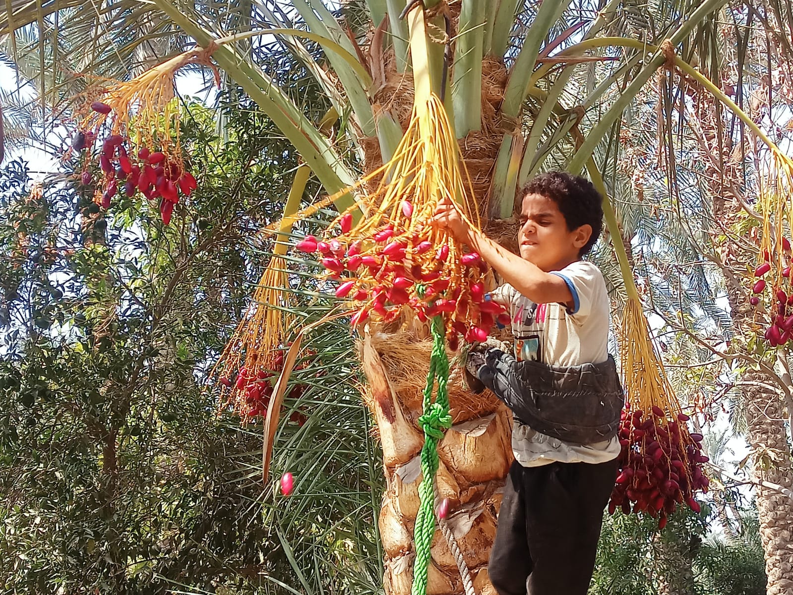 بفرحة عارمة وحماس شديد، يستقبل الصغير موسم حصاد البلح ليشارك مع أسرته في مراحله المتعددة، إذ يمتاز "عبدالرحمن" بالذكاء والفطنة التي تُنير عينيه، حتى أنه أصبح يقوم بكل أعمال الحصاد وكأنه رجل ذو قوة جسدية ضخمة، على الرغم من صغر سنه وقلة جسمه.