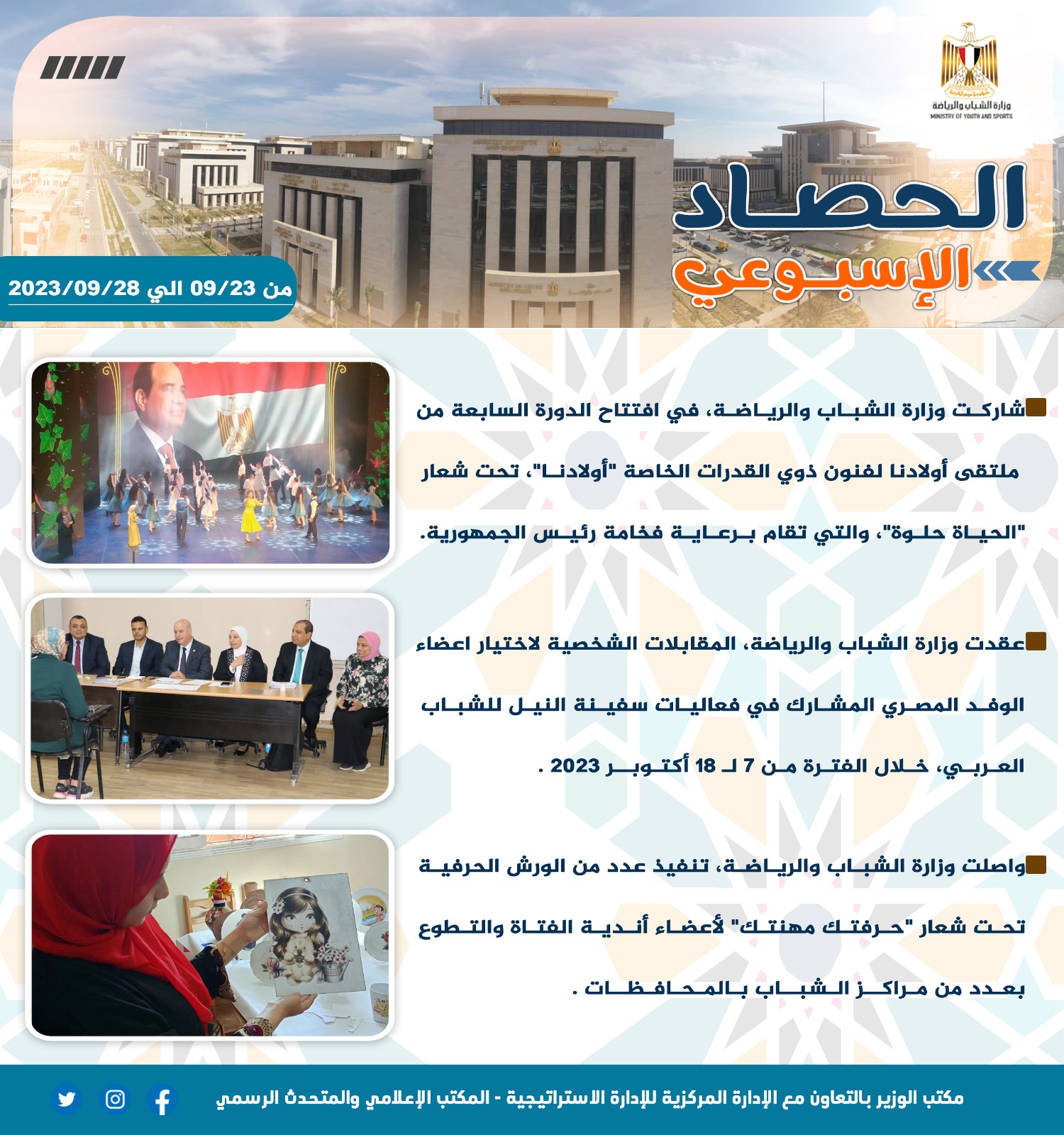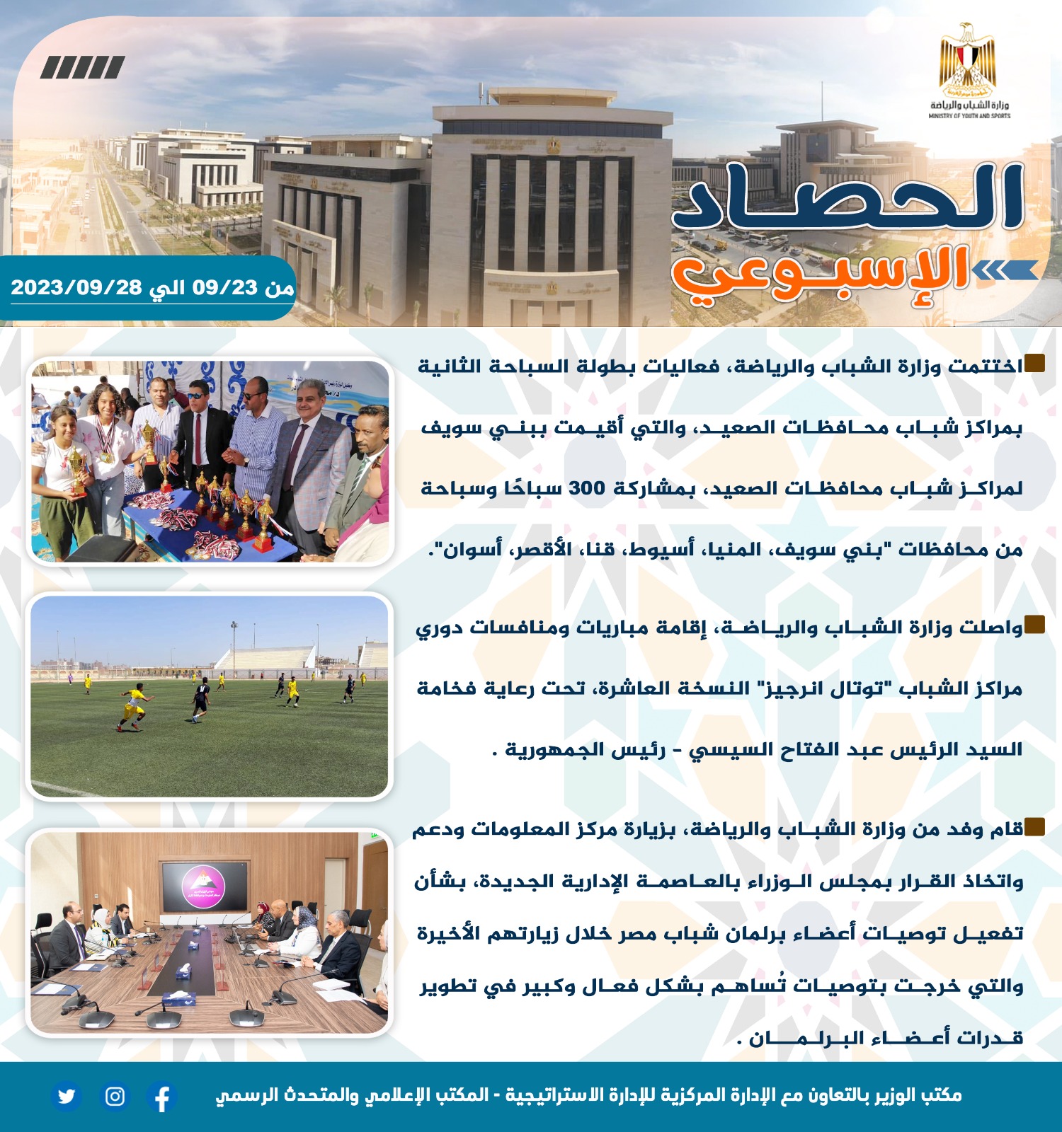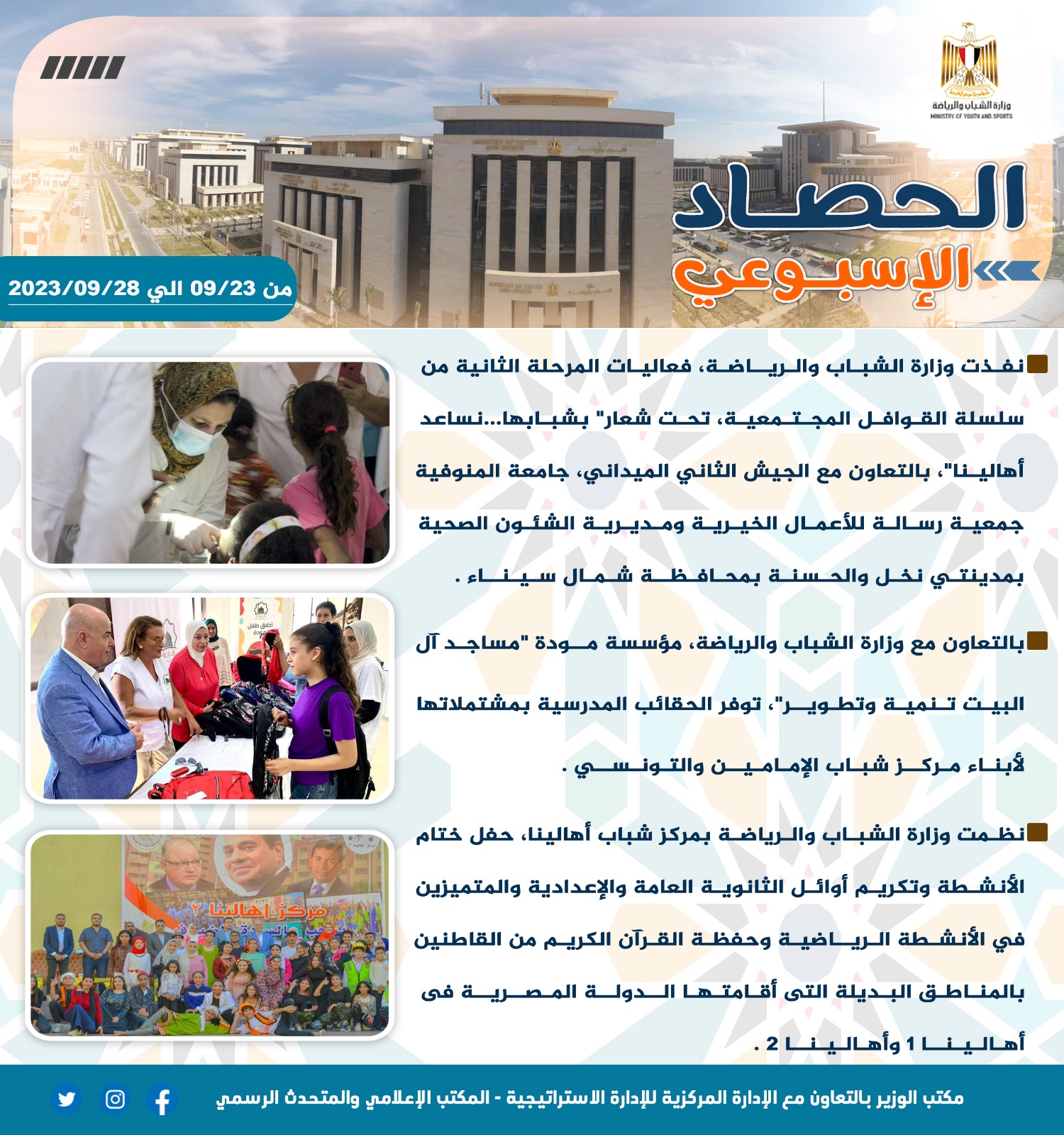 الشباب والرياضة تصدر حصادها الأسبوعي لأهم أنشطة وبرامج وفعاليات الوزارة