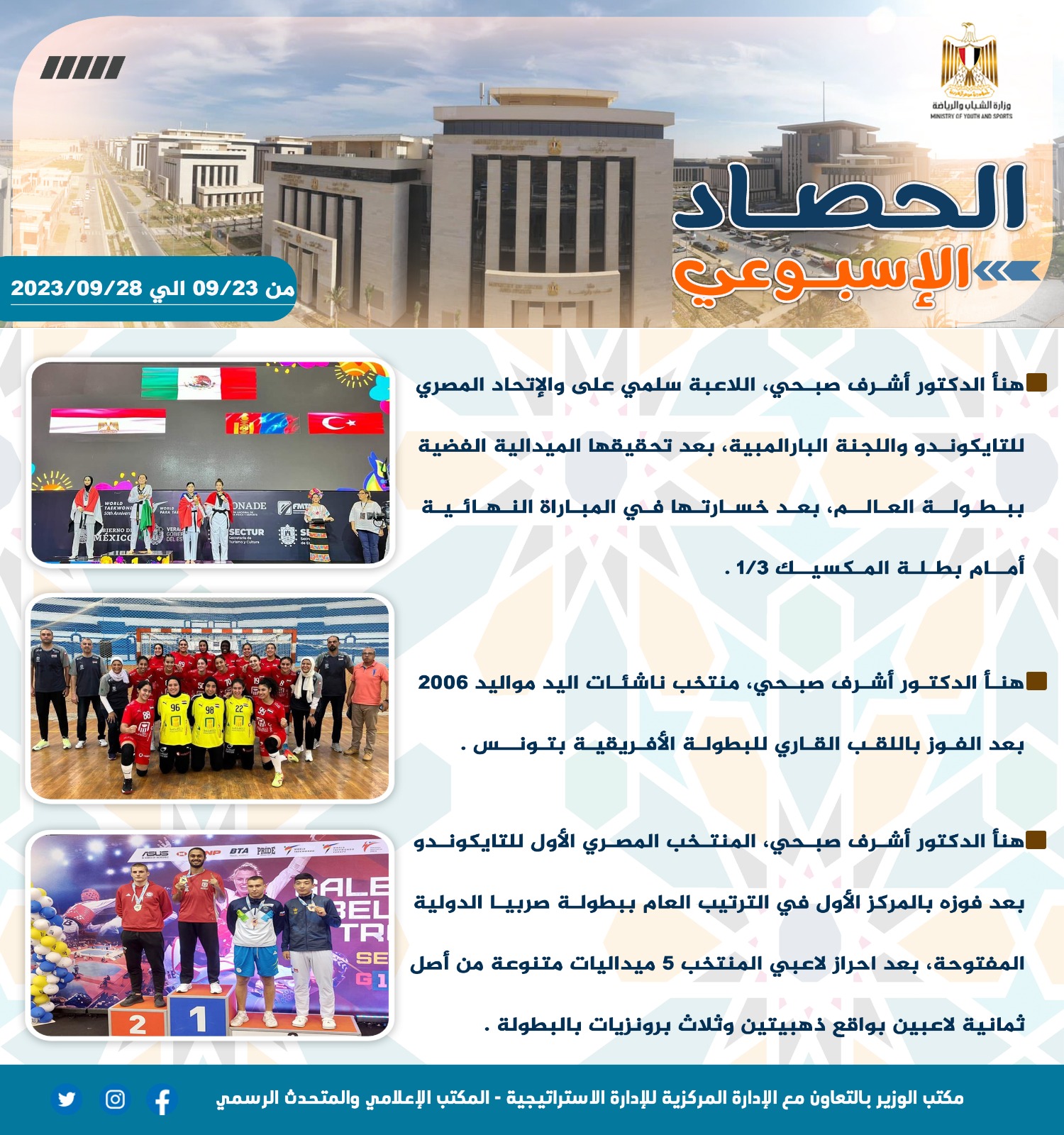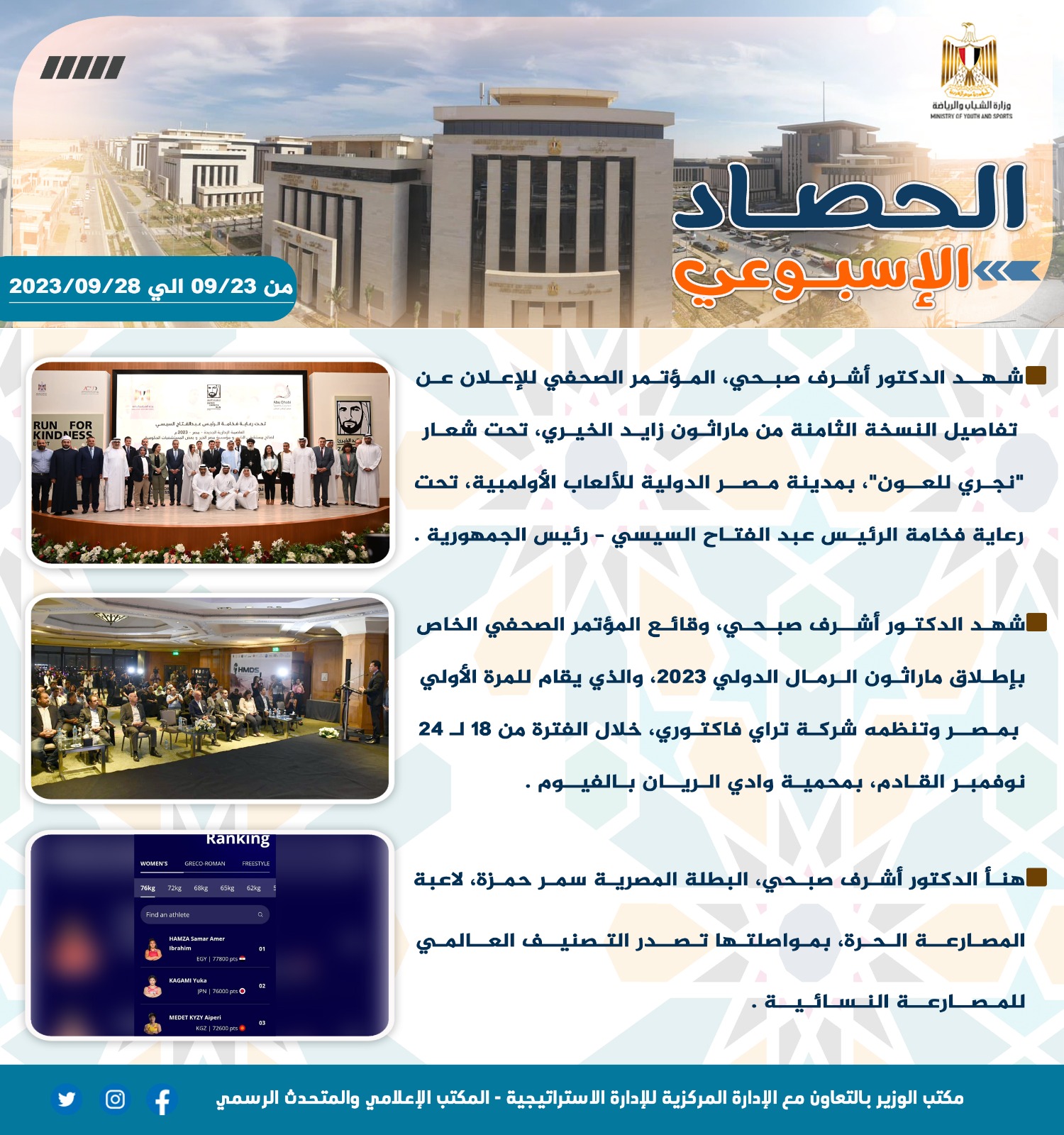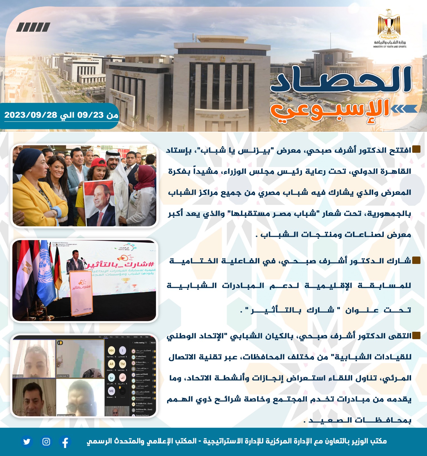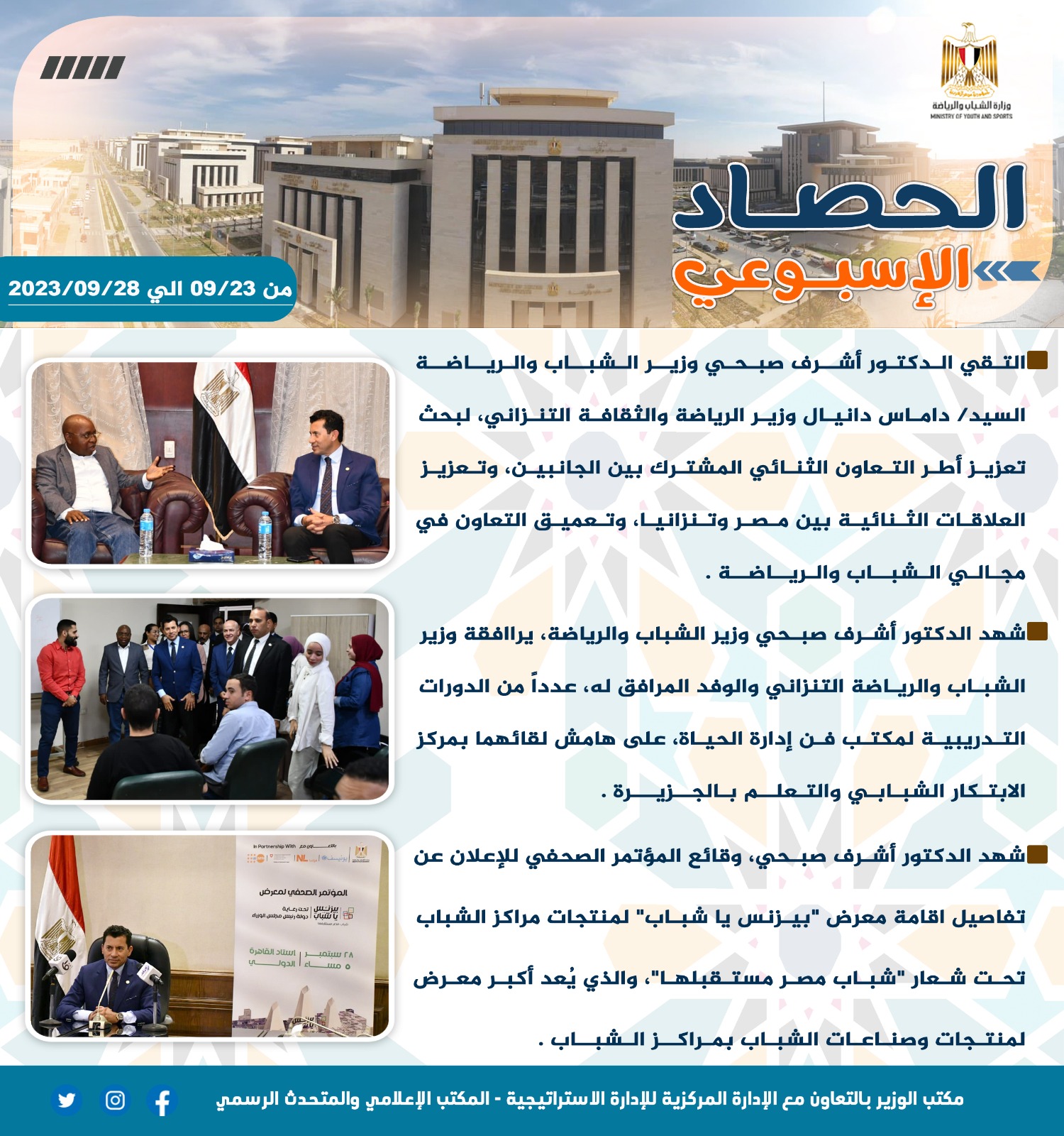 أصدرت وزارة الشباب والرياضة تقريرها الأسبوعي بالانفوجراف والذي يتضمن أهم اجتماعات وزيارات الدكتور أشرف صبحي وزير الشباب والرياضة بالإضافة إلى أهم أنشطة وبرامج قطاعي الشباب والرياضة بوزارة الشباب والرياضة وبعض الفاعليات مع مديريات الشباب والرياضة بالمحافظات والتي تم تنفيذها خلال الأسبوع من 23حتى 29 سبتمبر 2023 ونستعرض أهمها في التقرير الآتي: