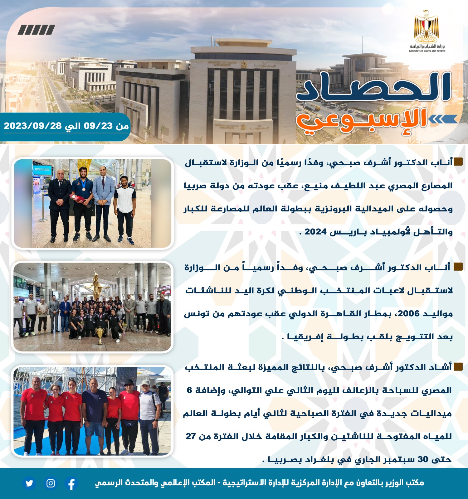 - أناب الدكتور أشرف صبحي، وفدًا رسميًا من الوزارة لاستقبال المصارع المصري عبداللطيف منيع، عقب عودته من دولة صربيا، وحصوله على الميدالية البرونزية ببطولة العالم للمصارعة للكبار، والتأهل لأولمبياد باريس ٢٠٢٤.
